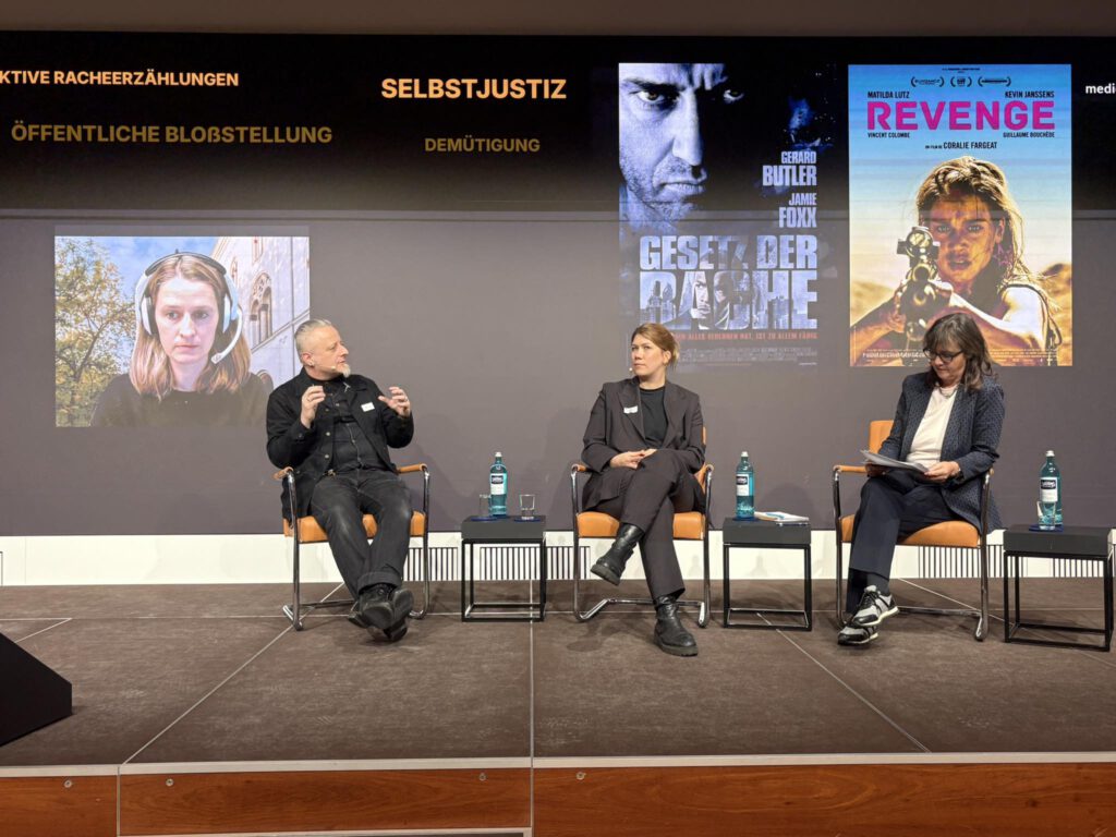 Livemitschnitt (Ausschnitt) Foto von Michal Kosakowski: Prof. Dr. Ruth Wendt (LMU München), Prof. Dr. Marcus Stiglegger (Filmwissenschaftler), Rebecca Richter (RICHTER legal),Vera Linß (Moderation) Programm 26.11.25 14.00 Uhr BEGRÜẞUNG Claudia Mikat (FSF e.V.) TEIL I: ZUM PHÄNOMEN RACHE 14.05 Uhr IMPULS RacheEine kulturphilosophische Annäherung Dr. Fabian Bernhardt (FU Berlin) 14.35 Uhr GESPRÄCH Psychologische Ursachen von RacheProf. i. R. Dr. Manfred Schmitt (RPTU Kaiserslautern-Landau) 15.00 Uhr PAUSE TEIL II: RHETORIK DER RACHE IN DEN MEDIEN 15.30 Uhr IMPULS Rache und Verantwortung. Perspektiven des Jugendmedienschutzes Claudia Mikat (FSF e.V.) und Martin Drechsler (FSM e.V.) 16.00 Uhr GESPRÄCH Rebecca Richter (RICHTER legal)Prof. Dr. Marcus Stiglegger (Filmwissenschaftler)Prof. Dr. Ruth Wendt (LMU München)
